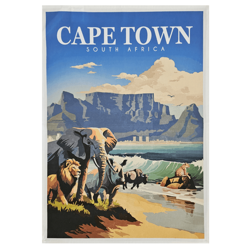 Our Cape Town Big Five tea towel depicts the iconic Table Mountain and an the infamous Big Five animals. Yes, we know that the Big Five don’t live on th beach but our creativity got the better of us. It’s the perfect Cape Town souvenir for friends or family abroad and guaranteed to arrive in one piece. Be sure to check out the two other designs in this range, namely the Cape Town Proteas and Cape Town Penguins tea towels.