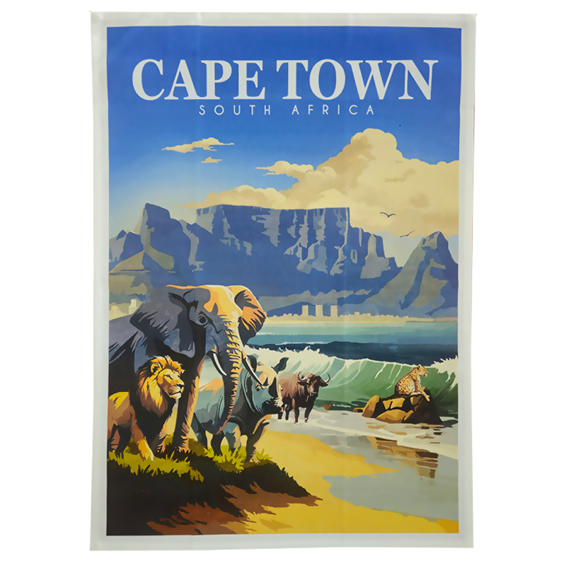 Our Cape Town Big Five tea towel depicts the iconic Table Mountain and an the infamous Big Five animals. Yes, we know that the Big Five don’t live on the beach but our creativity got the better of us. It’s the perfect Cape Town souvenir for friends or family abroad and guaranteed to arrive in one piece. Be sure to check out the two other designs in this range, namely the Cape Town Proteas and Cape Town Penguins tea towels.