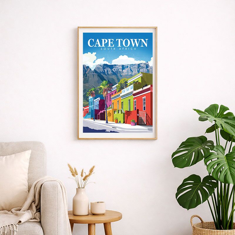 Take a piece of Cape Town home with our Cape Town Bo-Kaap art print featuring Table Mountain and the iconic, colourful houses of Bo-Kaap.