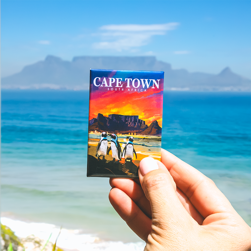 Our Cape Town Penguins magnet depicts the iconic Table Mountain and a happy trio of African Penguins. It’s the perfect Cape Town souvenir for friends or family abroad and small enough to fit into any bag.