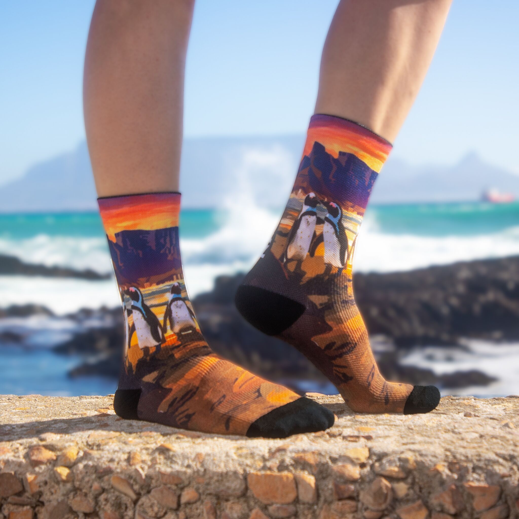 Our original design Cape Town Penguins socks will definitely elevate your sock game! The socks depict the iconic Table Mountain and a happy trio of African Penguins. These socks make the perfect Cape Town souvenir for friends and family abroad and are guaranteed to make a statement. Be sure to check out the other two original designs in this range, namely the Cape Town Proteas and Cape Town Big Five socks.
