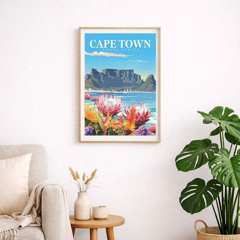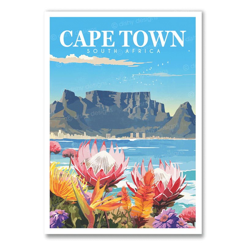 Take a piece of Cape Town home with our Cape Town Proteas art print, featuring the iconic Table Mountain and an array of indigenous flowers including the King Protea.