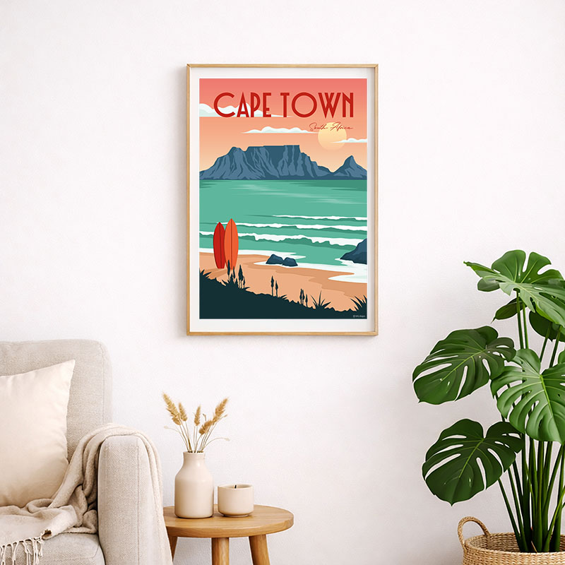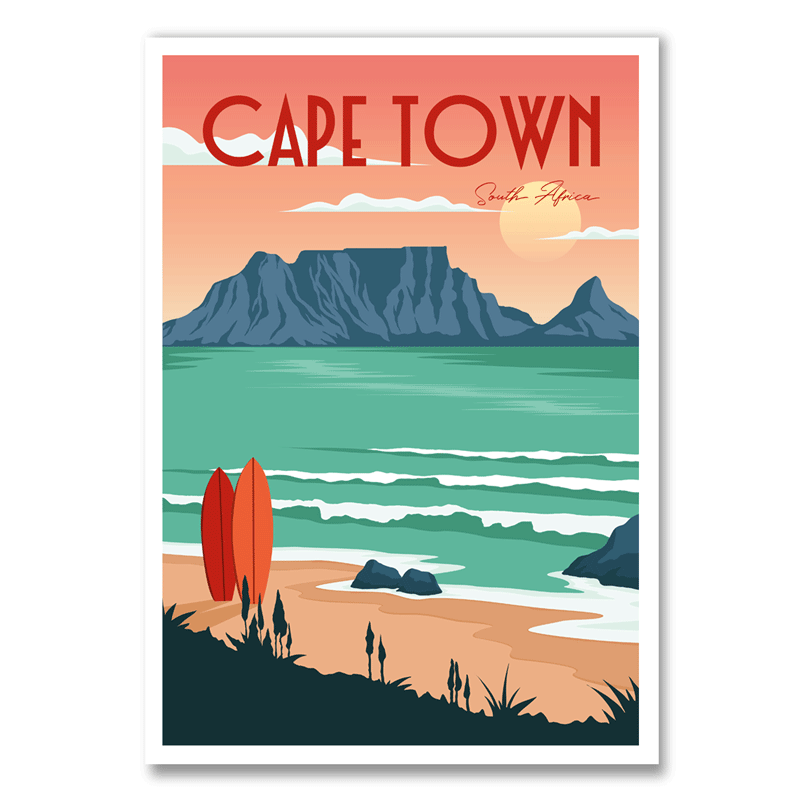 Take a piece of Cape Town home with this Cape Town Surf art print, featuring Table Mountain and surfboards in a bold art deco style.