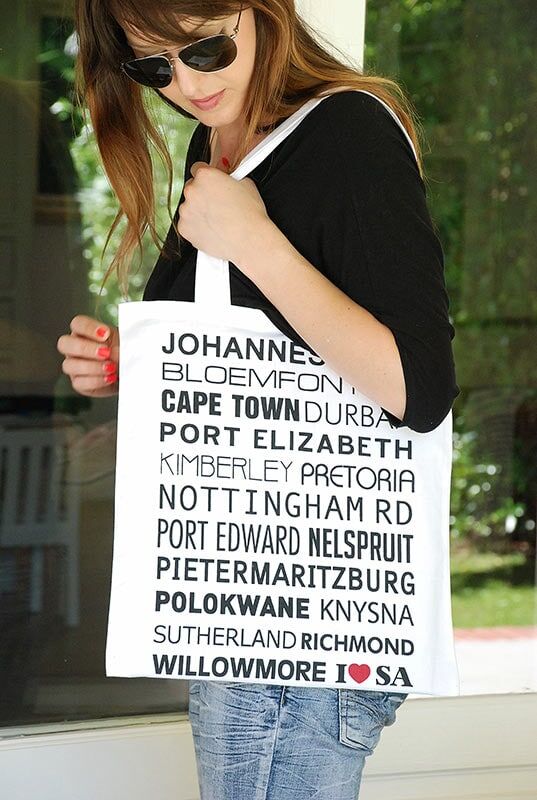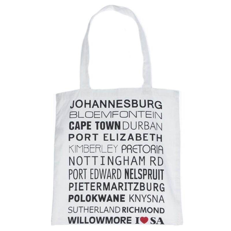 The I love SA shopper bag has South Africa’s major cities and a selection of smaller, charming towns printed onto it.
